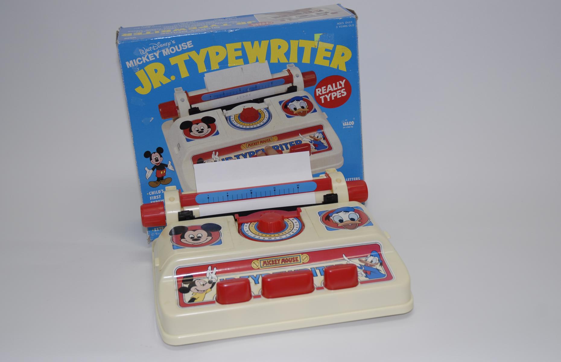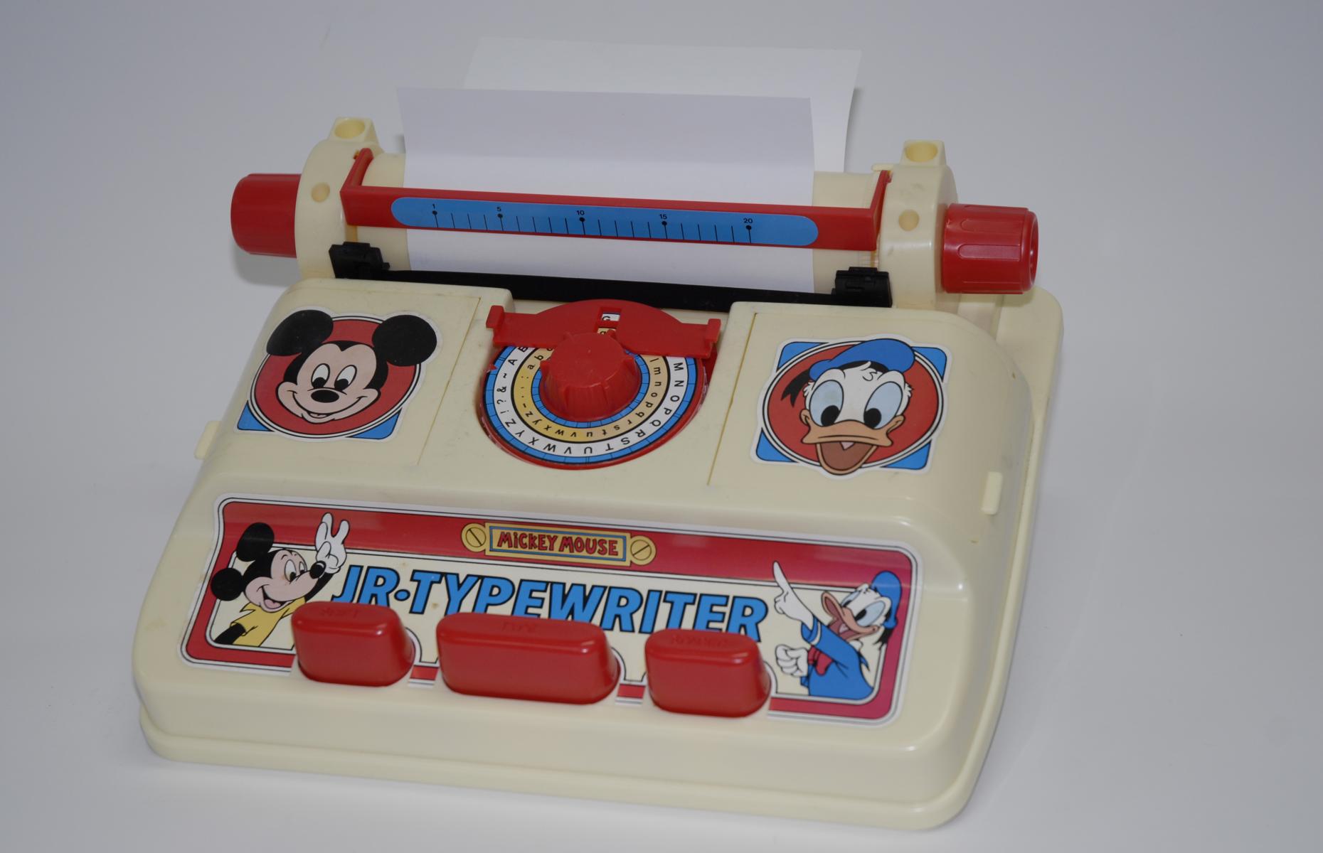 Dial-Schreibmaschine. Die Buchstaben und Sonderzeichen werden über ein Drehrad ausgewählt. Die Type-Taste druckt Großbuchstaben. Zusätzlich gibt es eine Shift- und eine Space-Taste.