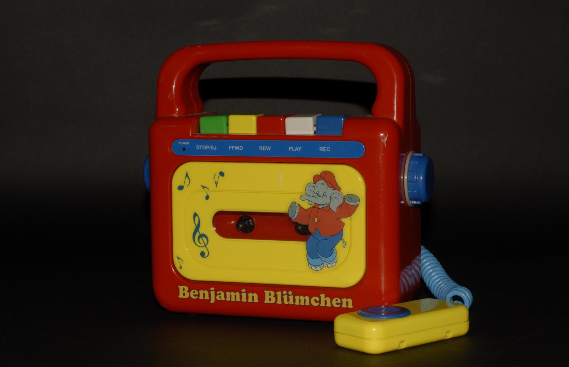 Tragbarer Kassettenrekorder inkl. Mikrofon im Benjamin Blümchen-Design. Mithilfe des Mikrofons (in der Form eines Diktaphons an Kabel angehängt) können Aufnahmen gemacht werden - ganz im Stile der "rasenden Reporterin Karla Kolumna".