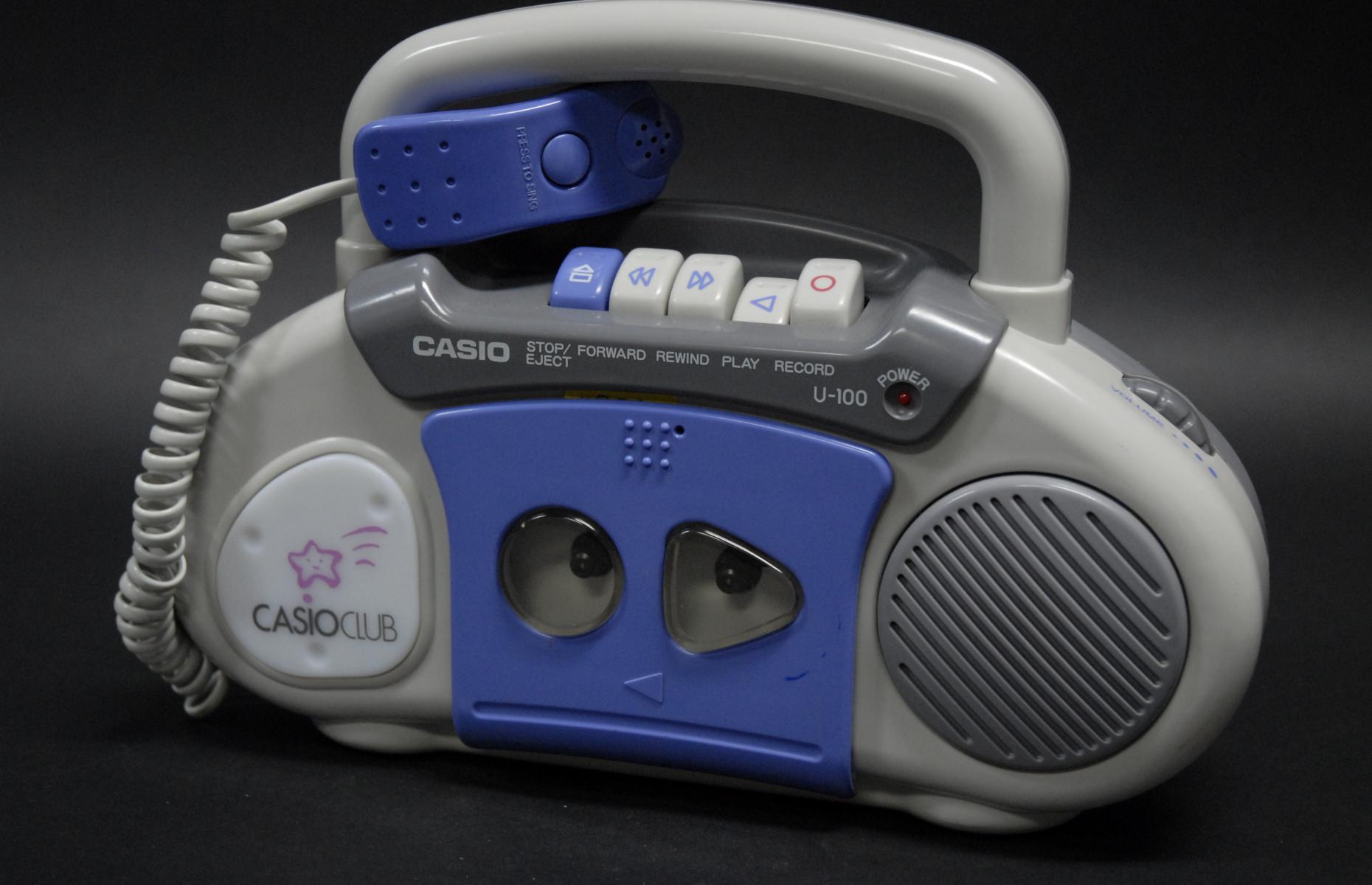 Tragbarer Kinderkassettenrekorder. Graues Gehäuse mit lila Kassettendeck und ein links im Gehäuse verstautes lila Mikrofon in Handy-Form. Batteriebetrieben. Inklusive Netzbuchse.