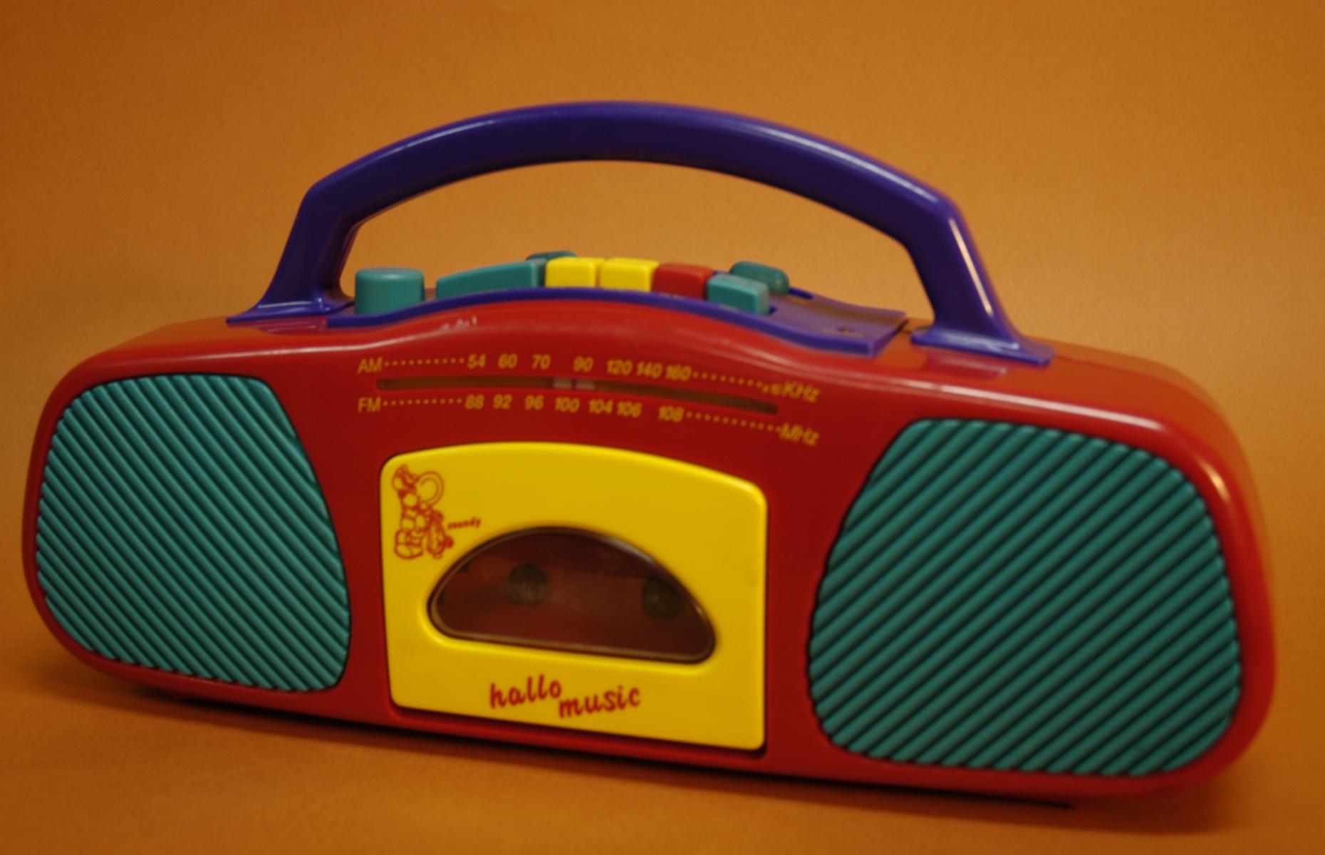 Kinderkassettenrekorder mit Radio im Design eines Ghettoblasters mit Tragegriff und Mikrofonhalterung. Der Rekorder ist rot, mit violettem Henkel, türkisem Lautsprecher und gelbem Kassettendeckel. Batteriebetrieben. Inklusive Kopfhöreranschluß und Netzbuchse.
