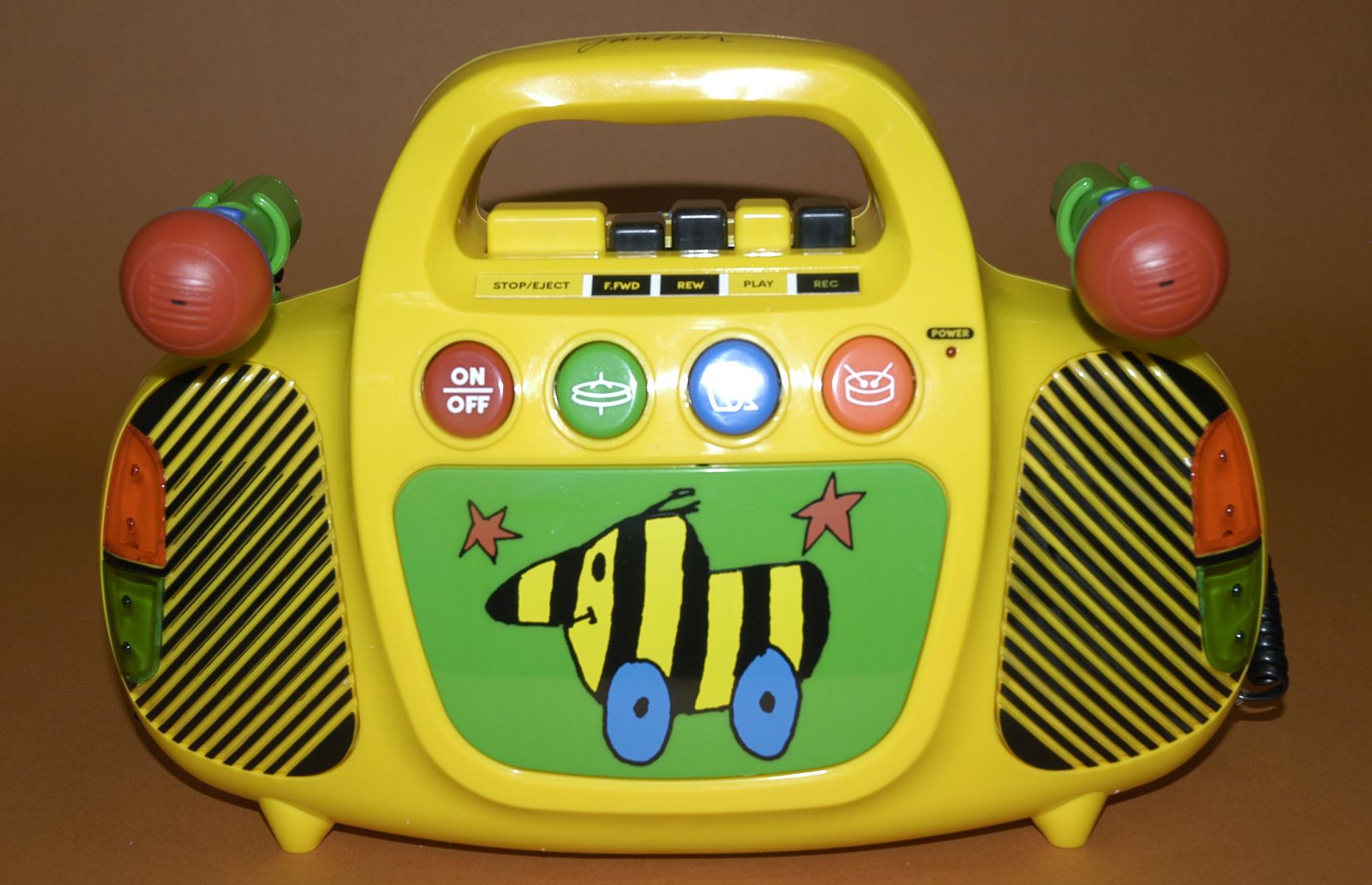 Kinderkassettenrekorder mit zwei Mikrofonen. Im gelben Tigerenten-Design gehalten. Batteriebetrieben. Zusätzliche Funktionen: Becken, Trommel und Basstrommel zuschaltbar, Netzteil.