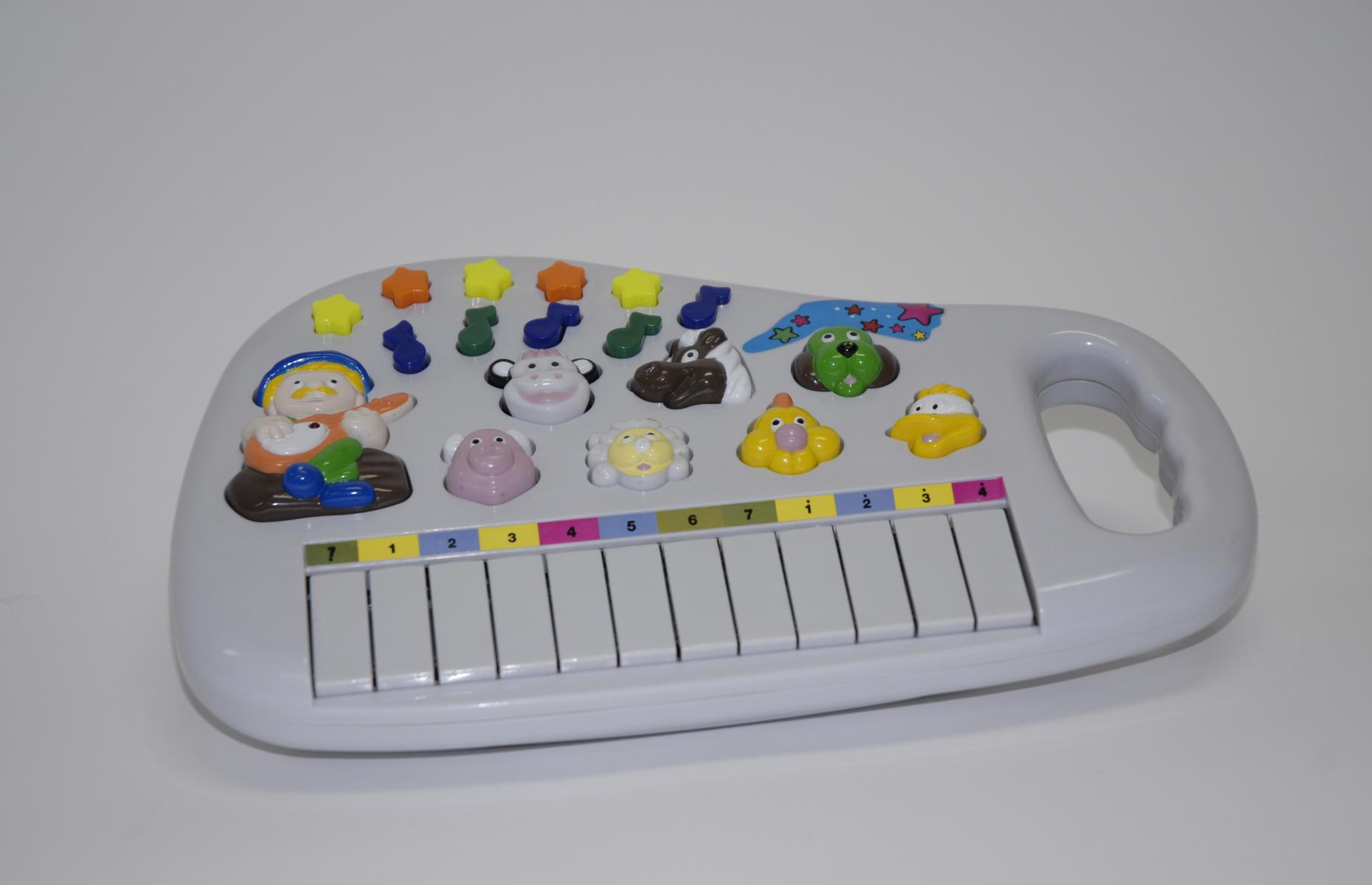 Graues Kinderkeyboard mit 18 Funktionstasten, 12 Klaviertasten und Tragegriff. Die Klaviertasten sind farb- und zahlencodiert. Sieben "Tiertasten" produzieren Tierlaute. Fünf Notentasten und fünf Sterntasten.