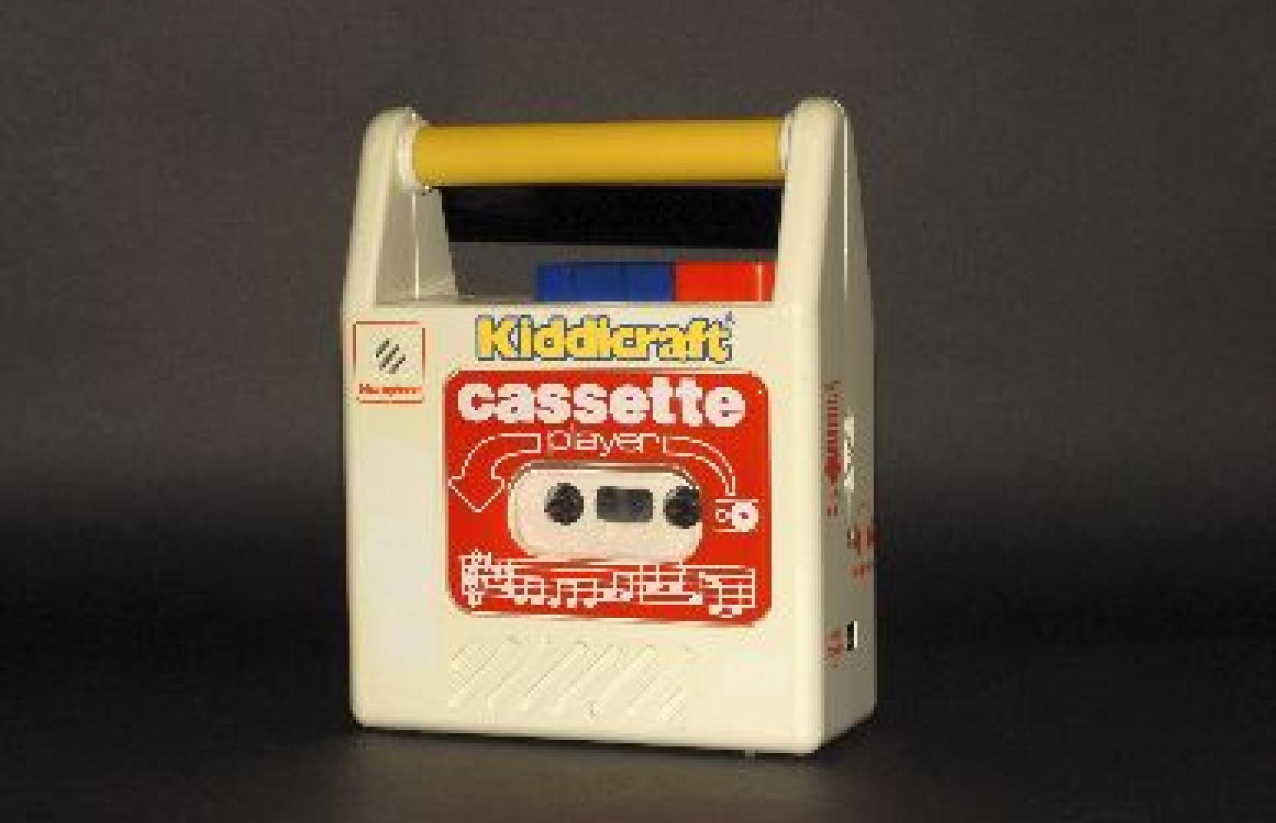 Kinderkassettenrekorder mit ins Gerät integriertem Mikrofon und Tragegriff. Weiß-rote Kassettendeckklappe.