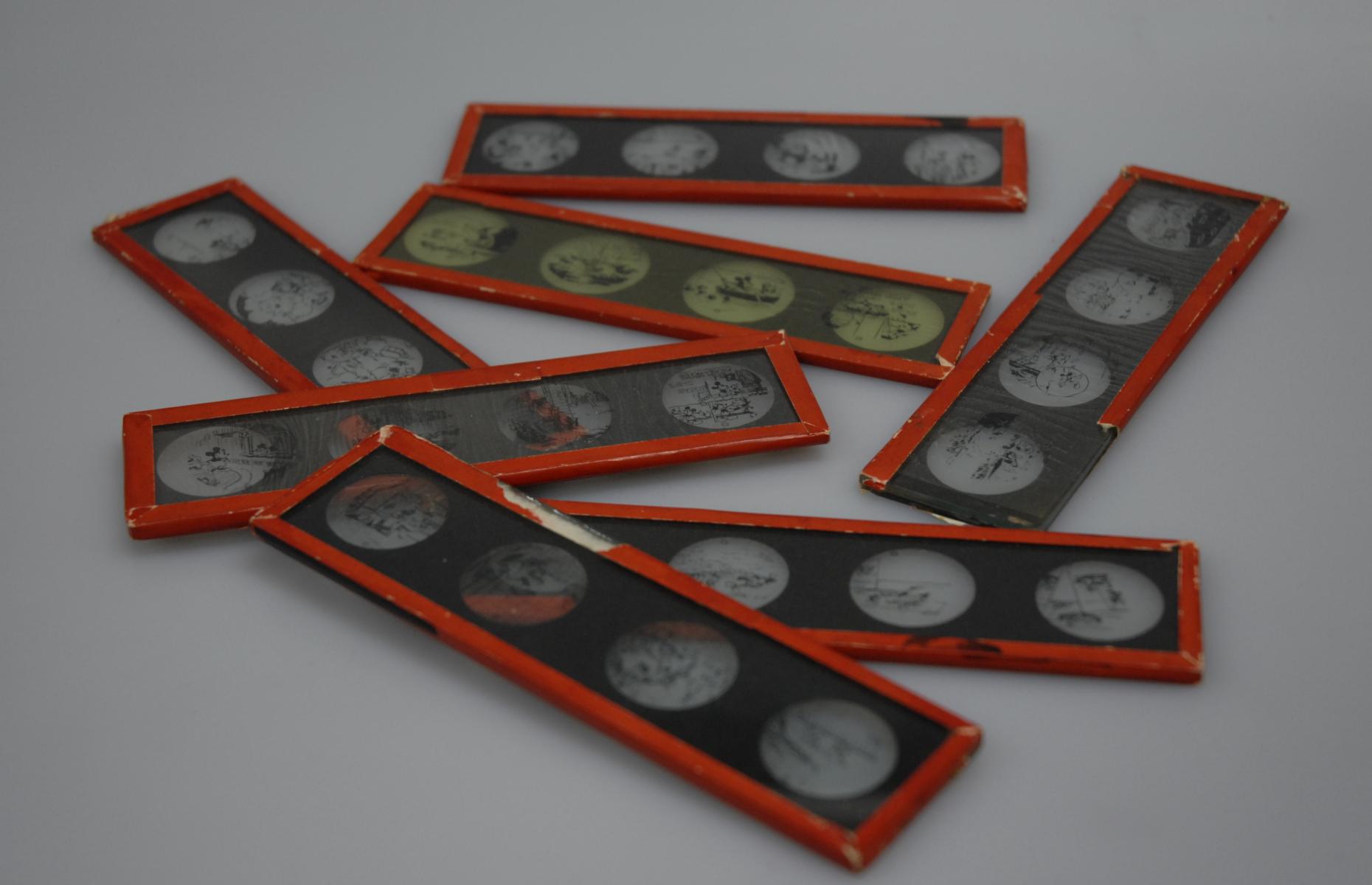 Die Geschichten sind dem Buch 'Mickey Mouse Illustrated Movie Stories', verlegt von Dean & Son Ltd., entnommen. Die Folgen der Serie bestanden aus zwei Glasstreifen mit je vier runden, schwarz/weißen Comiczeichnungen. Die Glasstreifen sind mit rotem Papier eingefasst. Träger des Bildes ist eine zwischen die Gläser gepresste transparente Folie.