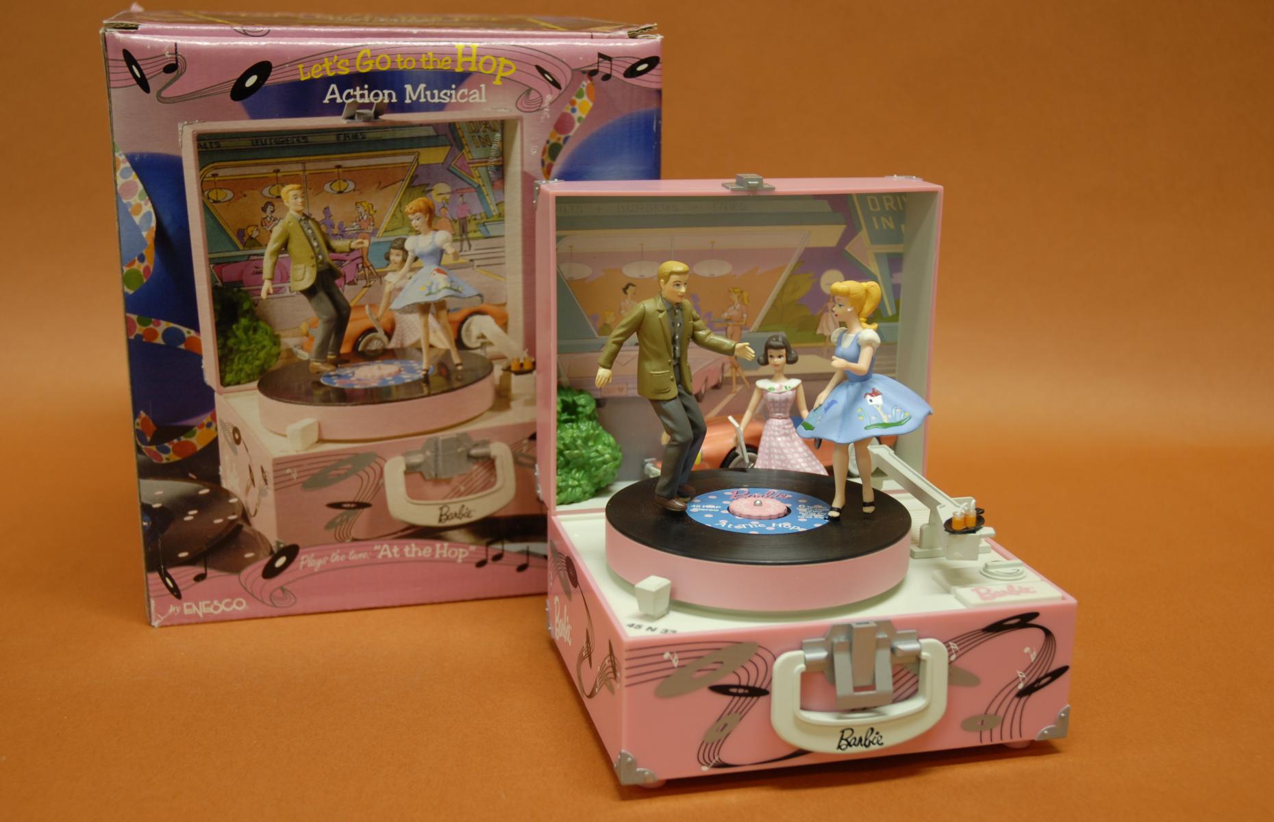 Die Uhr spielt den Song "At the hop". Barbie und Ken tanzen auf der Schallplatte. Liebevolles, detailgetreues Design, in kleinem rosa Köfferchen. Soll zurückversetzen in die 50er-Jahre. Nicht als Spielzeug gedacht (nicht für Kinder unter 8 Jahren).