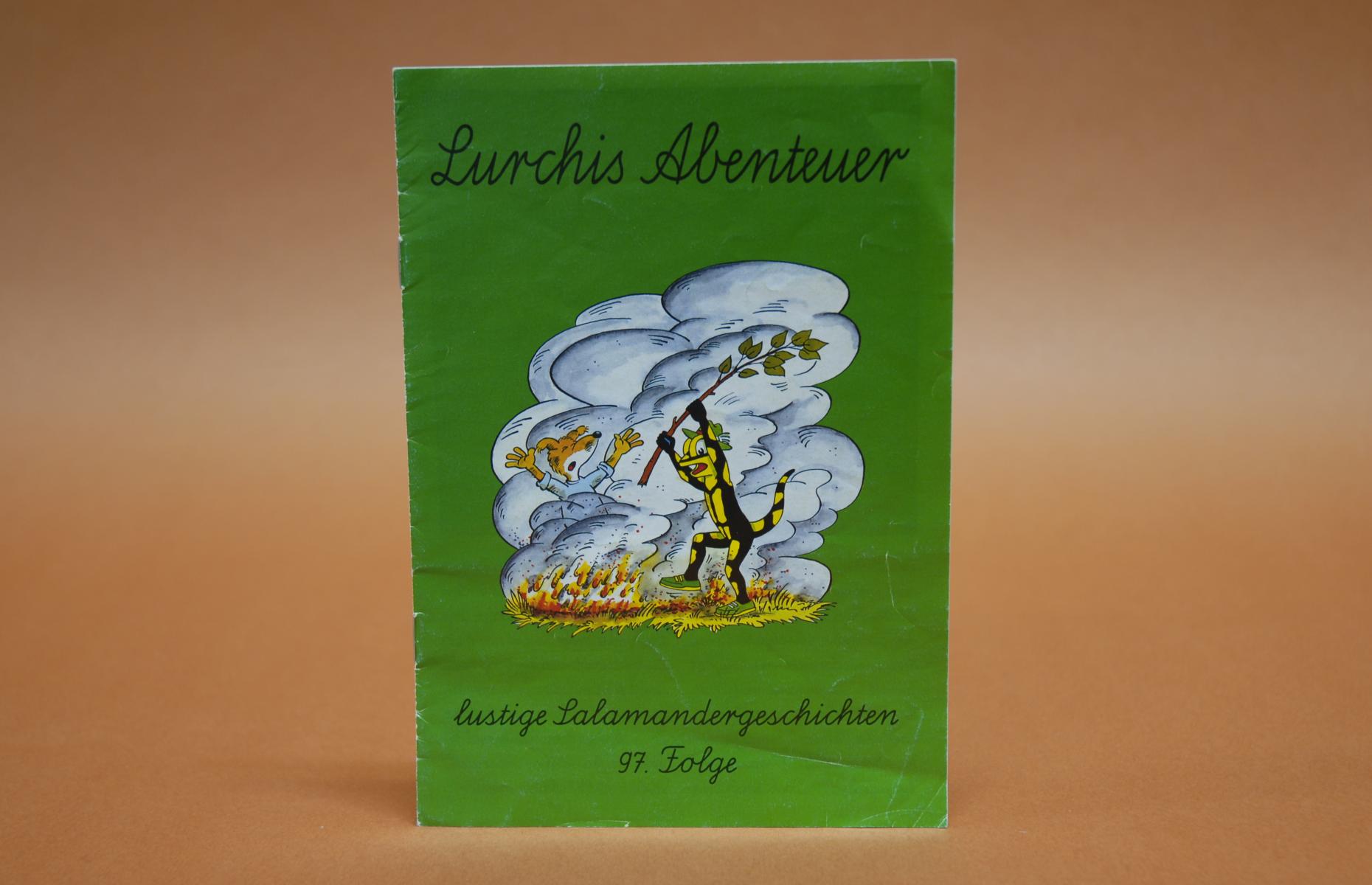 Viele bunte Illustrationen, Texte in Reimform und Schreibschrift. Manche Wörter rot gedruckt (z.B. "Salamander").