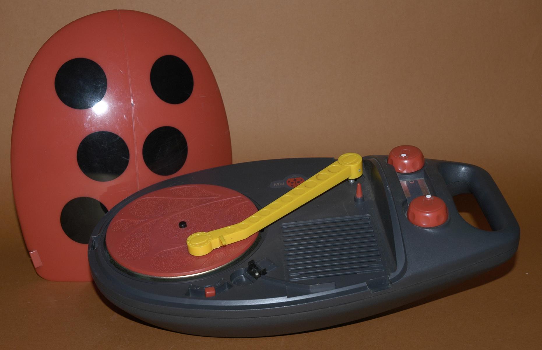 Kofferplattenspieler in Form und Design eines Marienkäfers. Spielt Platten in 33 und 45 rpm. Gelber Tonarm, batteriebetrieben.