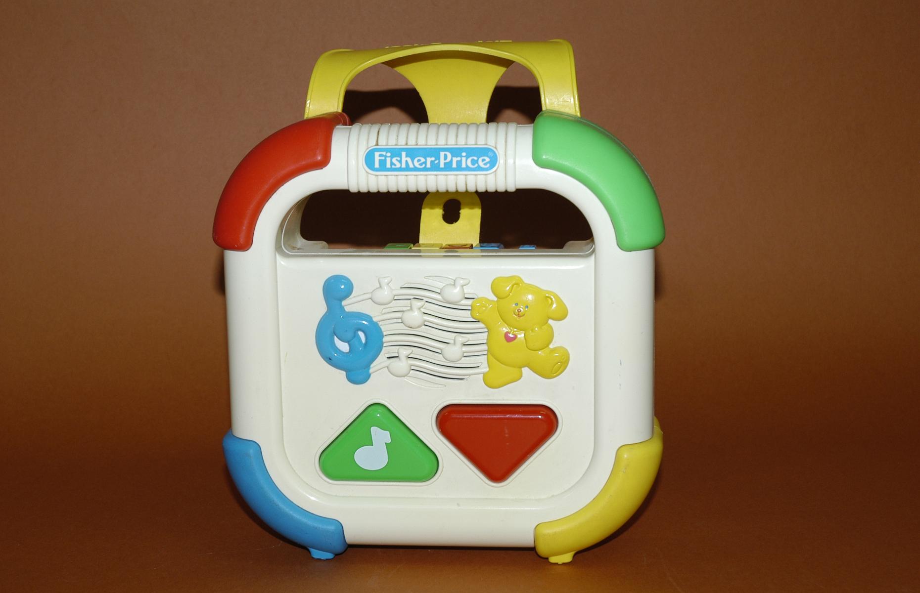 Kinderkassettenrekorder in der Form eines antiken Radios zum Befestigen an Kinderbett oder Wiege. Der Kassettenrekorder ist weiß mit bunten Ecken und gelben Plastik-Riemen. Die Lautsprecher besitzen Verzierungen im Stile tanzender Noten, eines großen, blauen Notenschlüssels und eines gelben Bärchens. Der Schloßschieber kann zum Blockieren der Tasten genutzt werden. Vorne besitzt der Kassettenrekorder zwei große, dreieckige Tasten und hinten ein Kassettendeck.