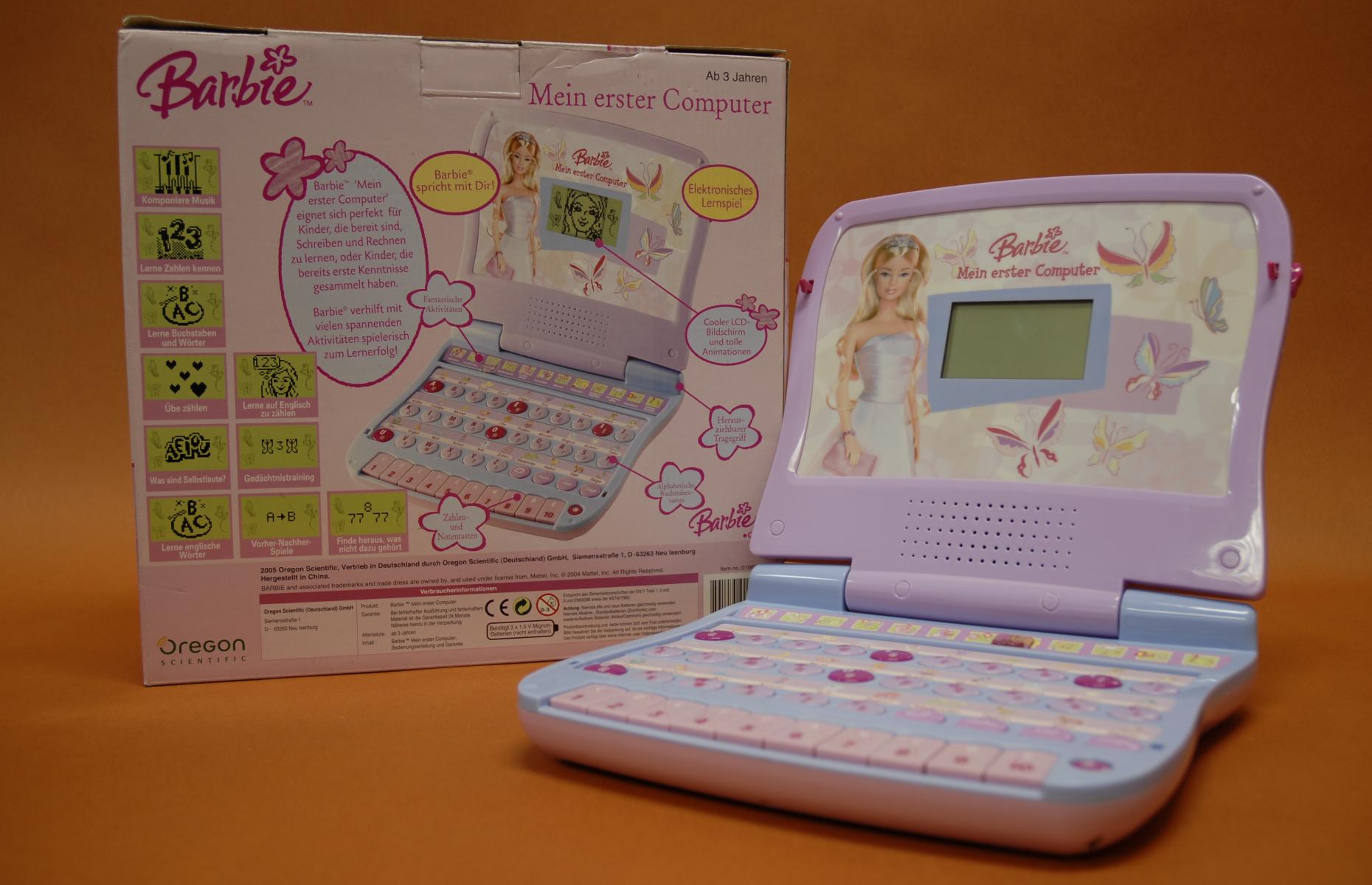 Pädagogisch wertvoll, altersgemäße Inhalte, in blau und flieder gehalten (Barbie-untypisch), relativ robust, mit Tragegriff, liebevolles Design. Tastatur mit Buchstaben (groß und klein), darüber Tierbilder (Bsp: Z für Ziege). Extra Tastatur für Töne (kleine Klaviertastatur) und Zahlen.