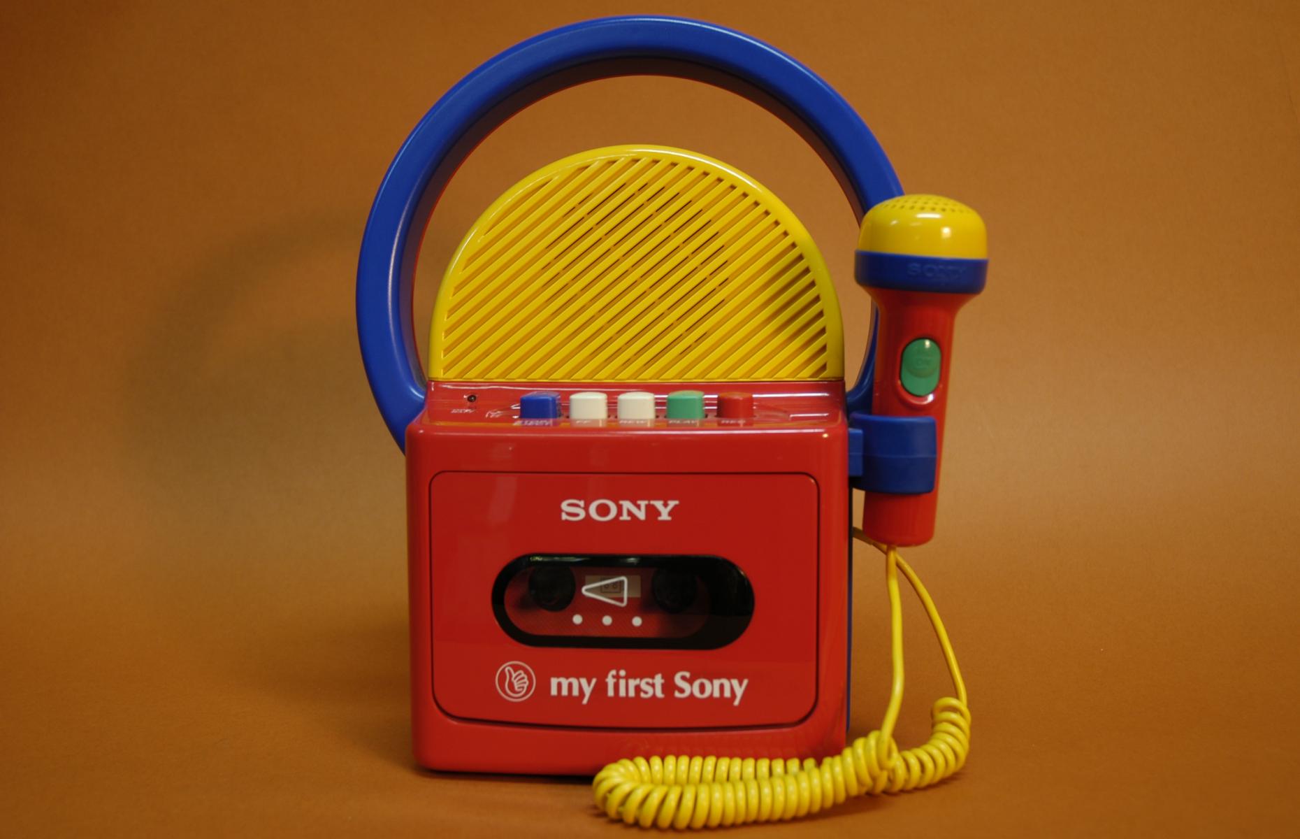 Kinderkassettenrekorder mit seitlich angebrachtem Mikrofon und Tragegriff. Korpus rot mit gelbem Lautsprecher, der sich bogenförmig über dem Gerät befindet. Die Henkel des Rekorders sind rot-blau. Batteriebetrieben. Inklusive Netzbuchse.