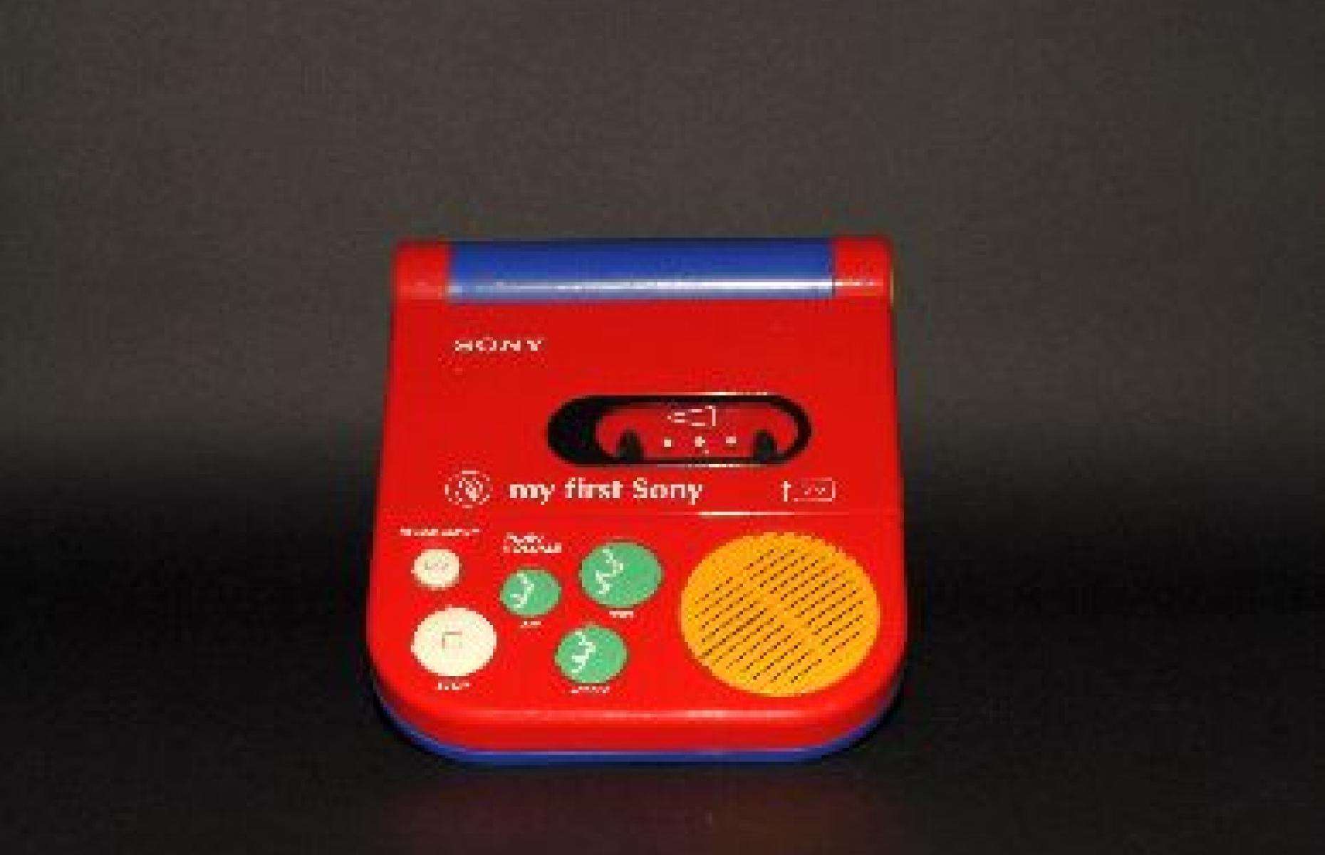 Flacher Kinderkassettenrekorder in rot mit gelbem Lautsprecher. Die Bedienung ist sehr simpel gehalten: es gibt lediglich eine Rewind-Taste, eine Stoptaste und drei Playtasten zur Wiedergabe in drei unterschiedlichen Lautstärken.