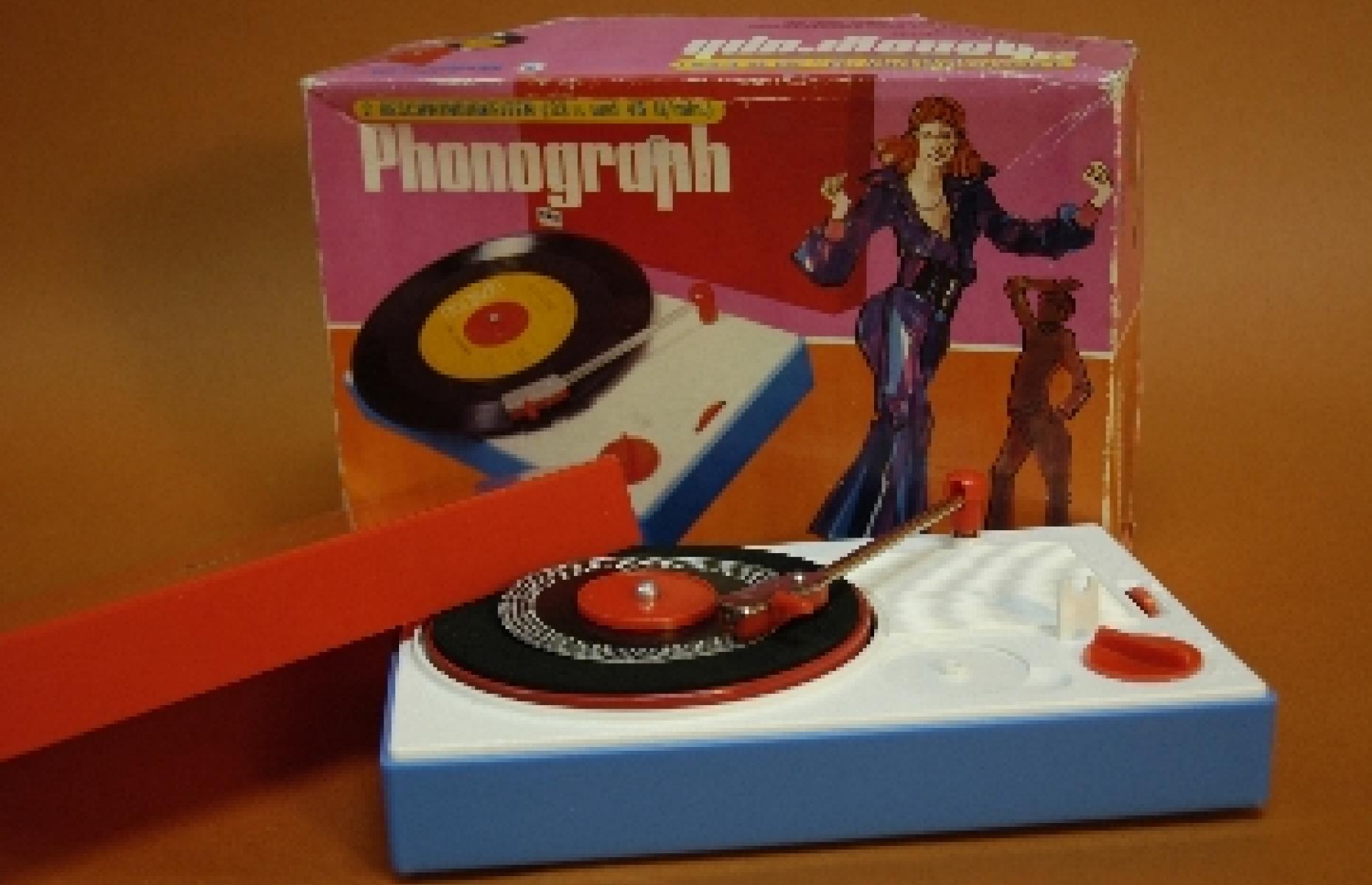 Kinderplattenspieler aus Plastik, 25 x 19 x 4 cm, batteriebetrieben. Blau-grün, gelber Plattenteller (15 cm) mit rotem Tonarm. Der Lautsprecher ist ins Gerät integriert.
