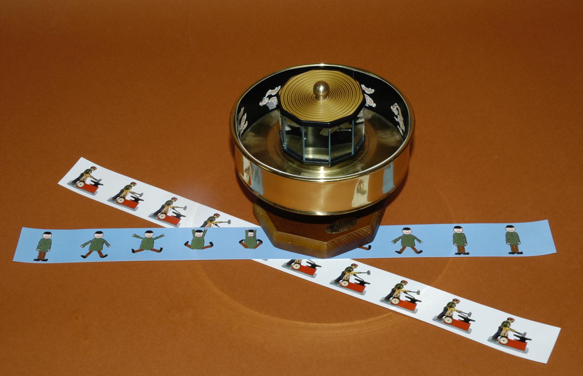Wird die Trommel, an deren Innenseite sich der Bildstreifen befindet, in Rotation gebracht, so spiegeln sich die einzelnen Phasendarstellungen auf dem in der Mitte angebrachten Spiegelkranz/-Prisma.