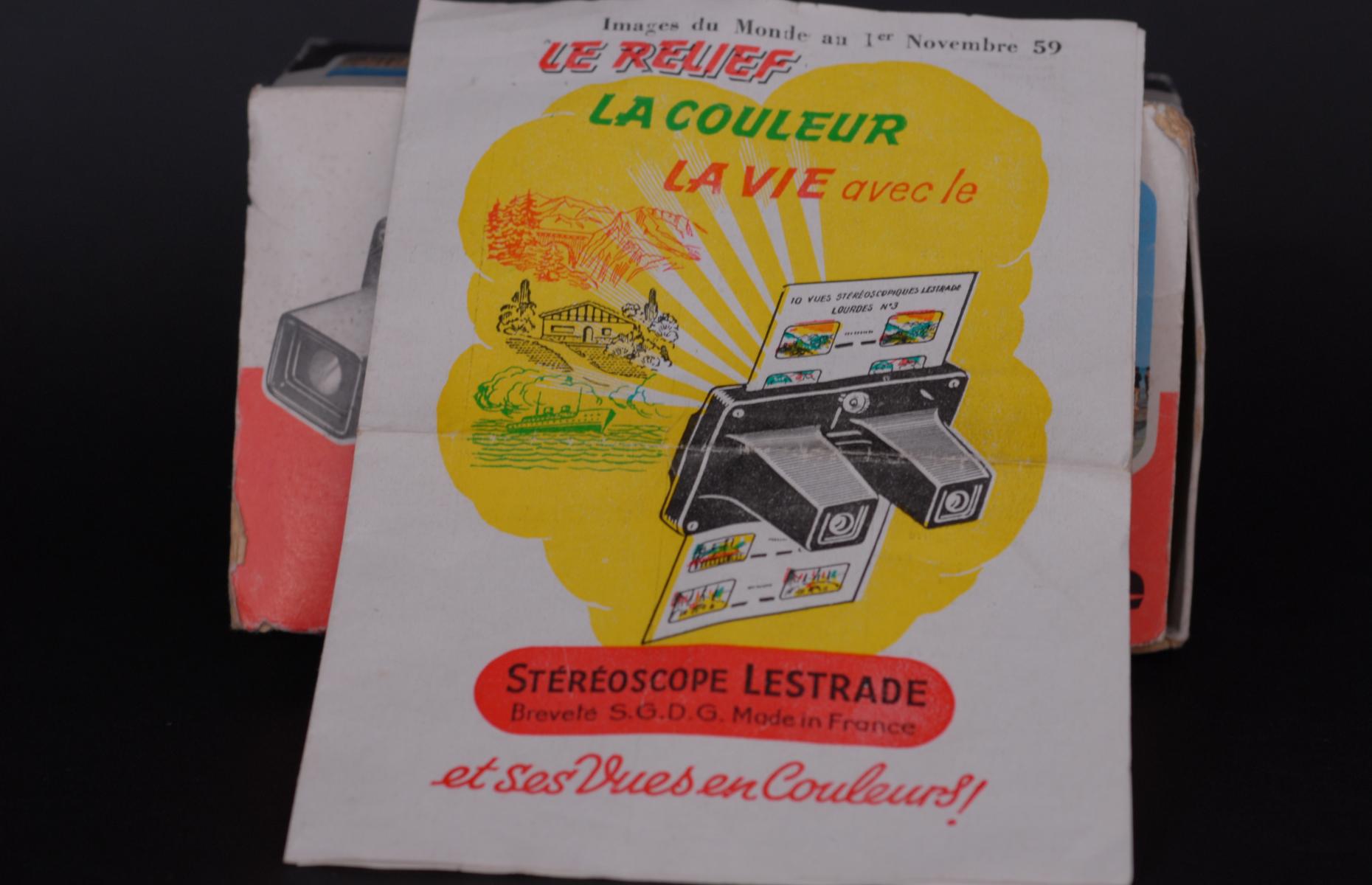Das Lestrade-System arbeitet im Gegensatz zum View-Master mit größeren Bildformaten (14,5 x 11,7 mm) und einer hohen Bildqualität auf Kodachrome-Film. Die Bildpaare sind untereinander auf einer 10 x 17 cm großen Bildkarte angeordnet, die mittels des Hebels durchs Gerät geschoben wird. Themen der Bildkarten waren hauptsächlich touristische Orte in Frankreich, Europa und Übersee. Daneben gab es noch Serien mit Märchen, Geschichten und Wissenwertes für Kinder.