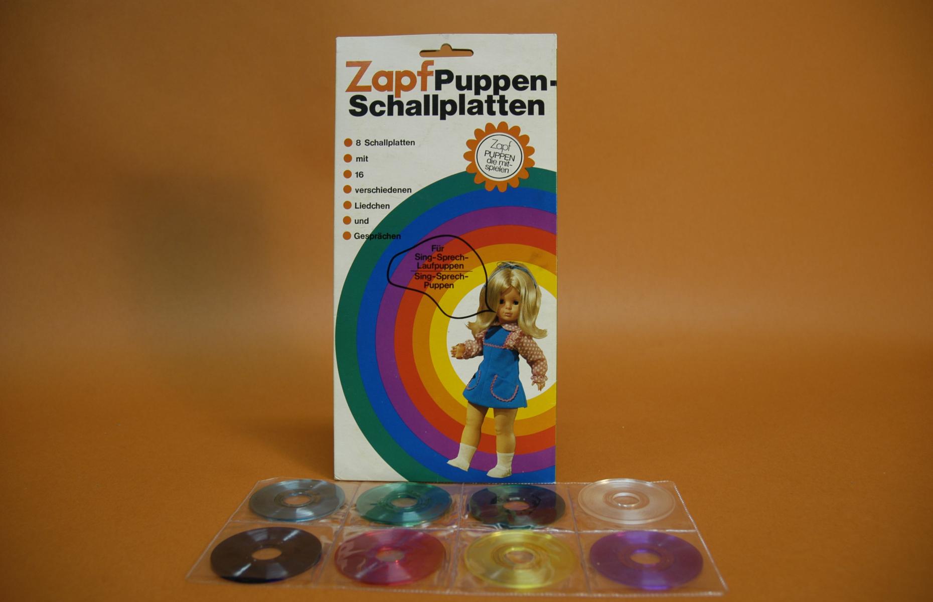 Sprechpuppenzubehör: 8 Schallplatten für Sing-Sprech-Laufpuppen mit 16 Kinderliedern und Gesprächen in Papierschuber.