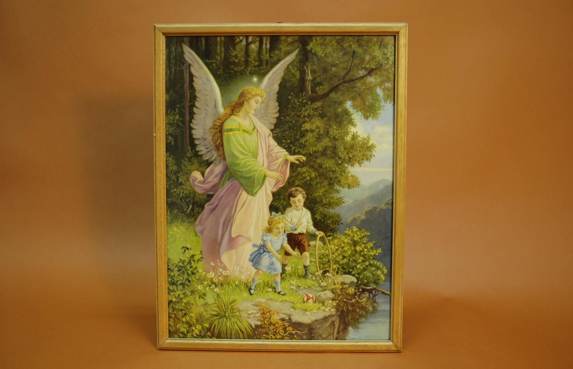 Großformatige Schutzengeldarstellung. Gezeigt wird ein klassisches Motiv: Ein weiblicher Engel bewacht am Abgrund spielenden Knaben und Mädchen. Als Spielgeräte dienen ein Holzreif und ein rot-weißer Ball.