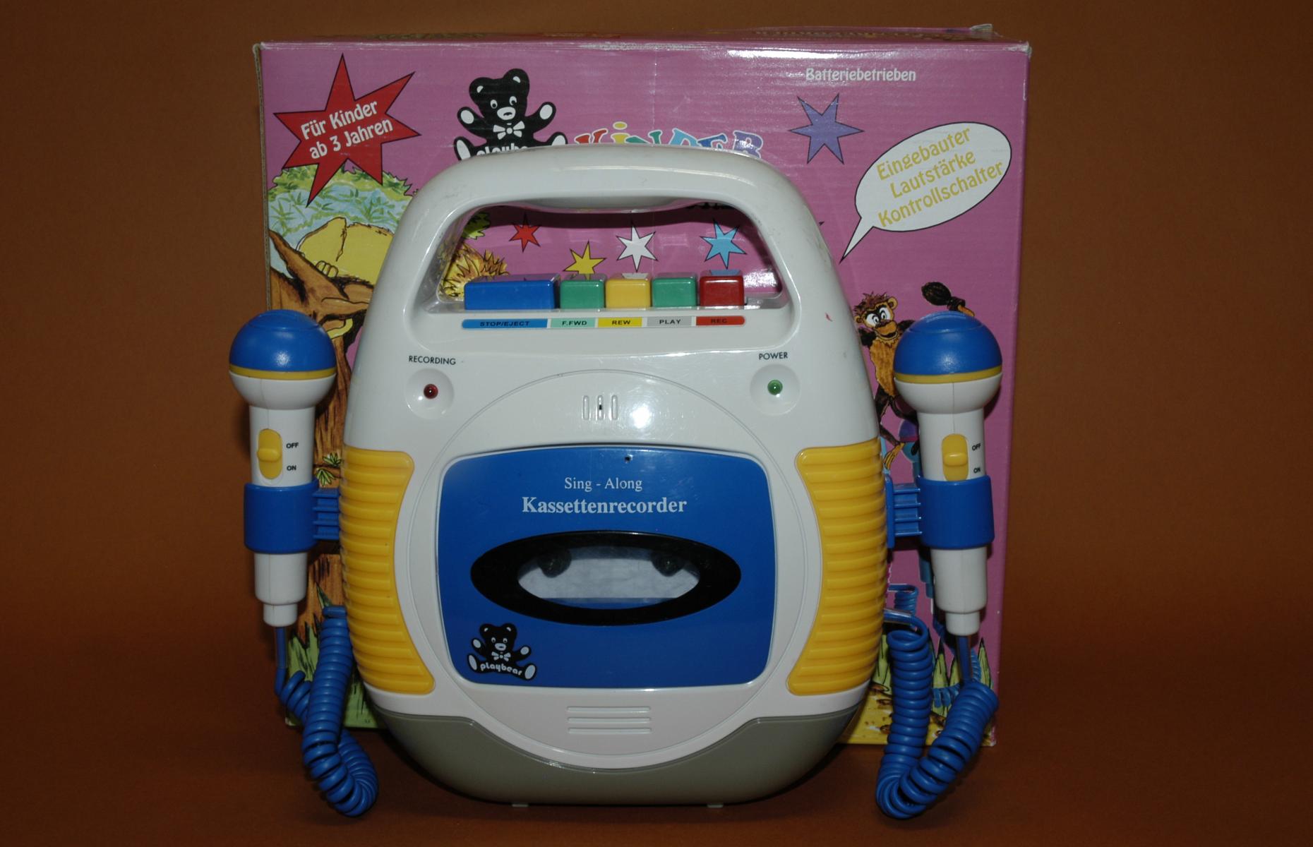 Kinderkassettenrecorder mit Tragegriff und zwei seitlich befestigten Mikrofonen. Weißer Korpus, blaues Kassettendeck, an den Seiten gelbe Gummirillen. Batteriebetrieben