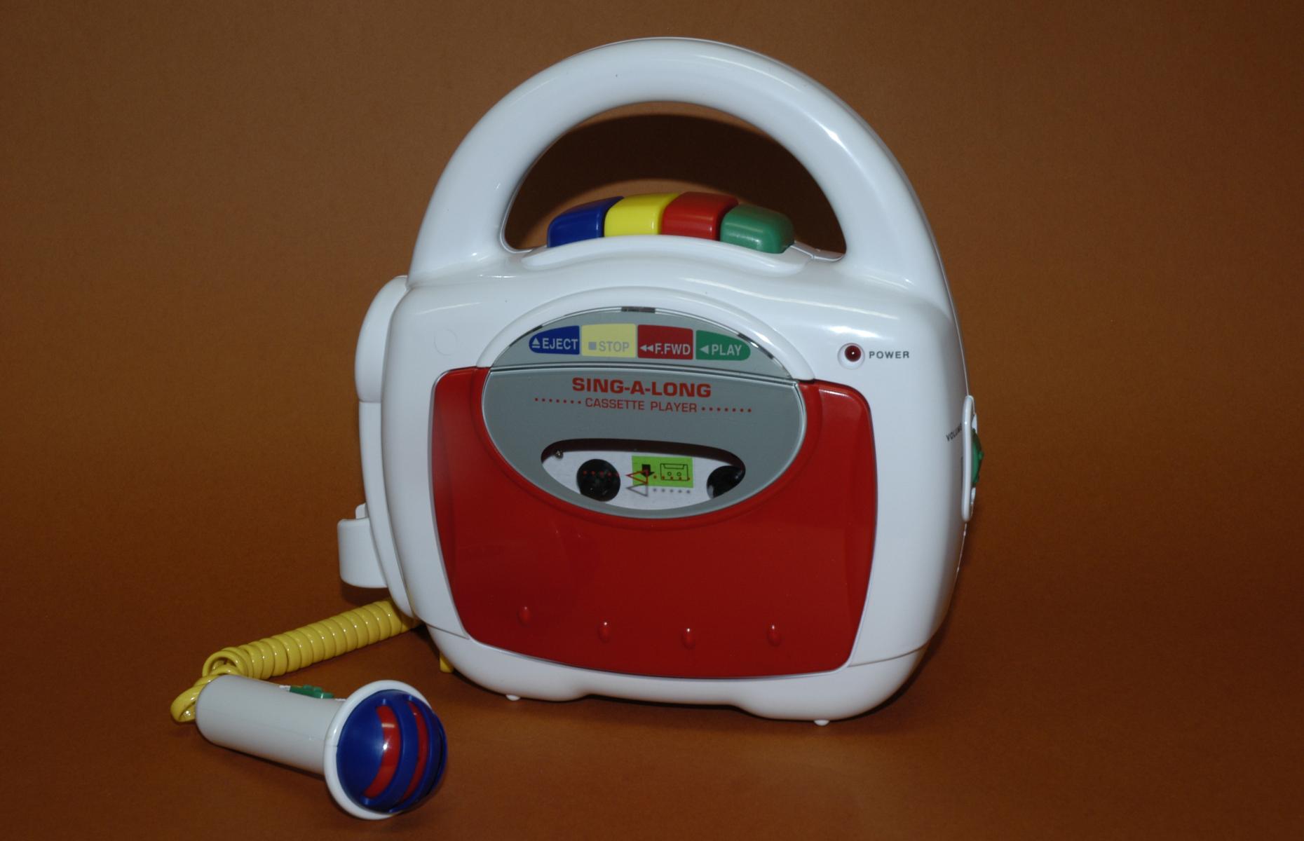 Kinderkassettenrekorder mit Tragegriff und an der Seite befestigtem Mikrofon. Der Kassettenrekorder ist weiß mit rotem Kassettendeck und bunten Tasten.