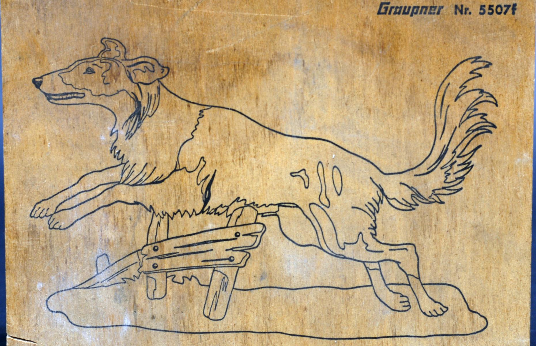 Das Motiv ist ein über ein Hindernis springender Collie-Hund, evtl. die bekannte Figur "Lassie". Hersteller ist die auch heute noch bestehende Modellbau-Firma Graupner. Der "berühmteste Hund der Welt", die Collie-Hündin Lassie wurde erstmals 1938 in einer Kurzgeschichte des amerikanischen Schriftstellers Eric Knight beschrieben. Es folgten Kinofilme und mehrere äußerst populäre Fernsehserien. Begleitend zu den Serien erschienen Bücher, Hörspielkassetten und weitere Medienverbundartikel.