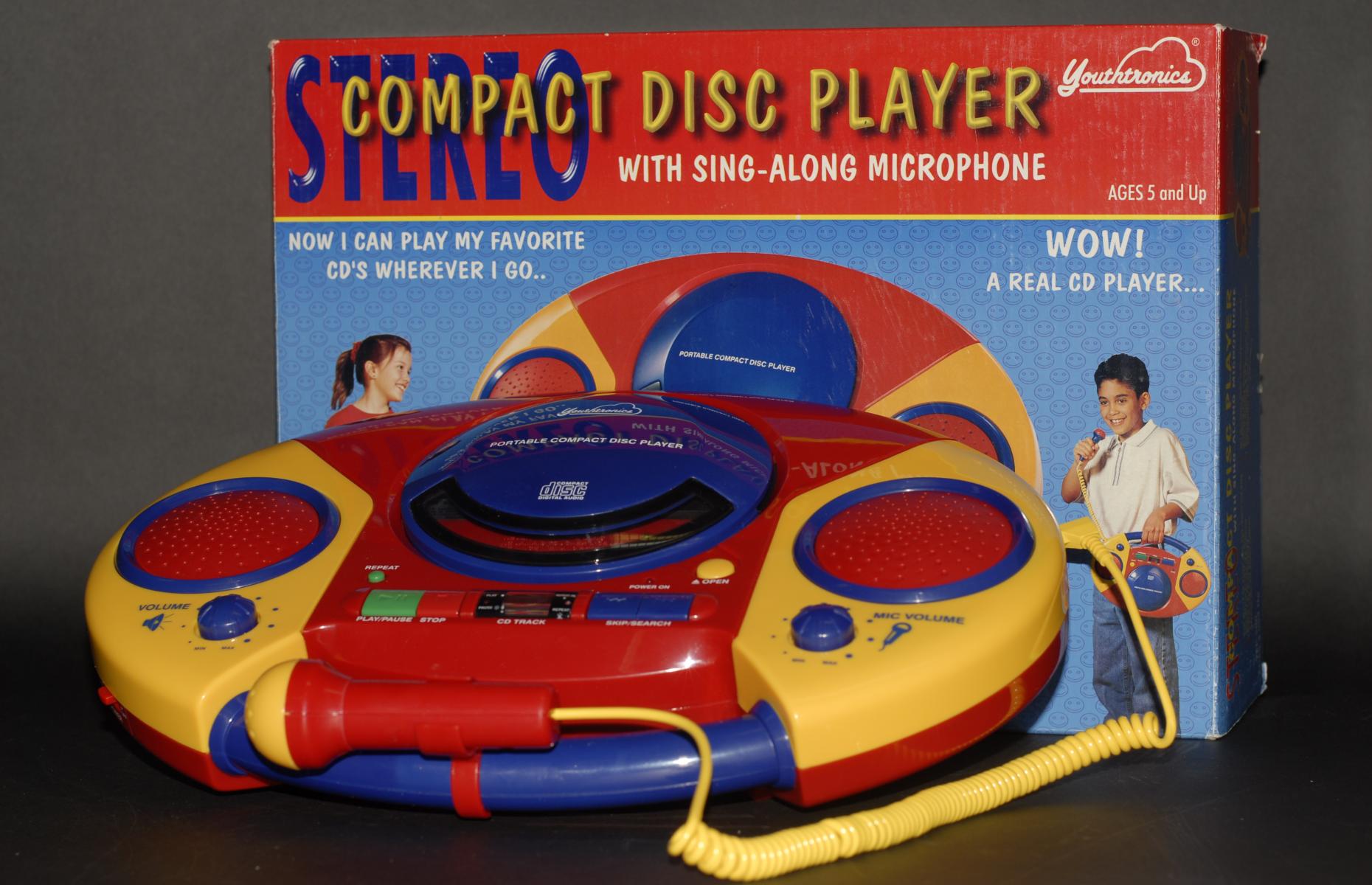Tragbarer, flacher CD-Player mit abnehmbarem Mikrofon in dern Farben Rot, Gelb und Blau. Inkl. zwei Mikrofonanschlüsse, Netzteilbuchse.