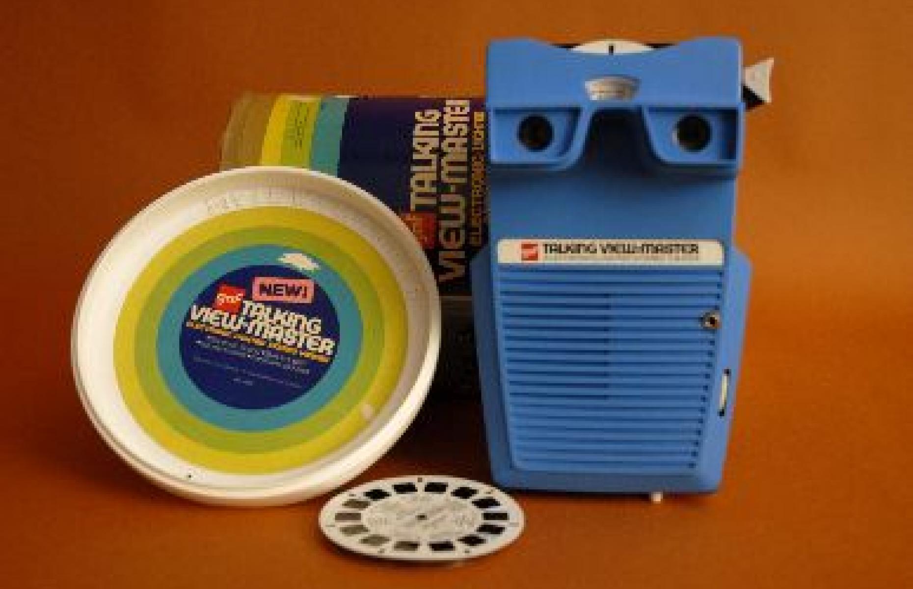 Betrachtungsgerät mit zwei Gucklöchern und integrierten kleinen Linsen, das direkt vor die Augen gehalten wird. Die Bilder sind in Form von Dias auf eine Pappscheibe aufgebracht. Die einzelnen Scheiben auch "Reels" genannt, bestehen aus sieben Stereo-Bildpaaren. Nach dem stereoskopischen Prinzip wird jedem Auge eine jeweils leicht unterschiedliche Version desselben Bildes gezeigt, sodass ein dreidimensionaler Eindruck vermittelt wird. Für den Betrachter scheint sich dadurch ein kleiner Raum zu öffnen, indem eine greifbare Welt existiert. Die Funktionsweise des View-Masters hat sich bis heute nicht grundsätzlich geändert. Der seitlich angebrachte Hebel dient zum Drehen der Scheibe.