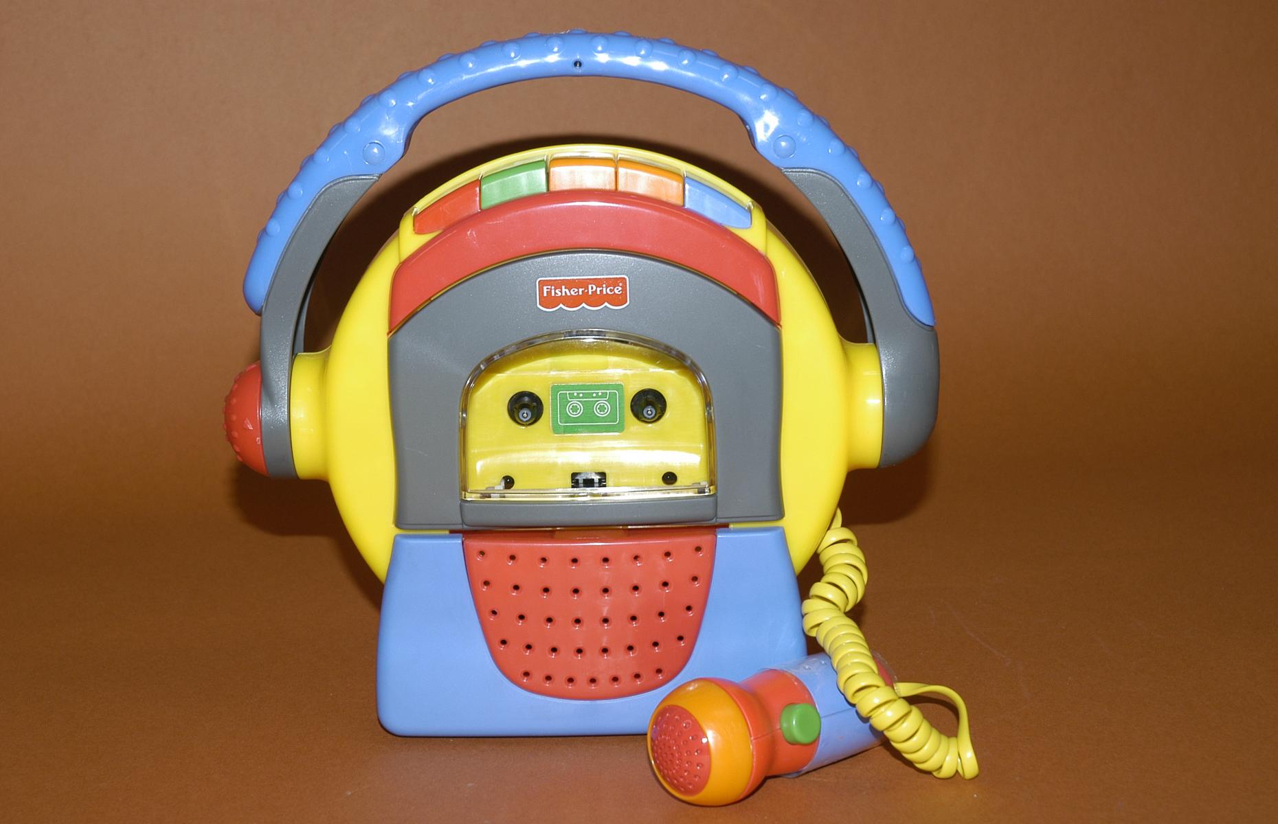 Stabiler Kinderkassettenrekorder mit in der Rückseite verstautem Mikrofon. Gelb-bunt mit blauem Tragegriff. Funktionen: Record, Fast Forward, Rewind, Play, Netzteilanschluß, Kopfhörerausgang.