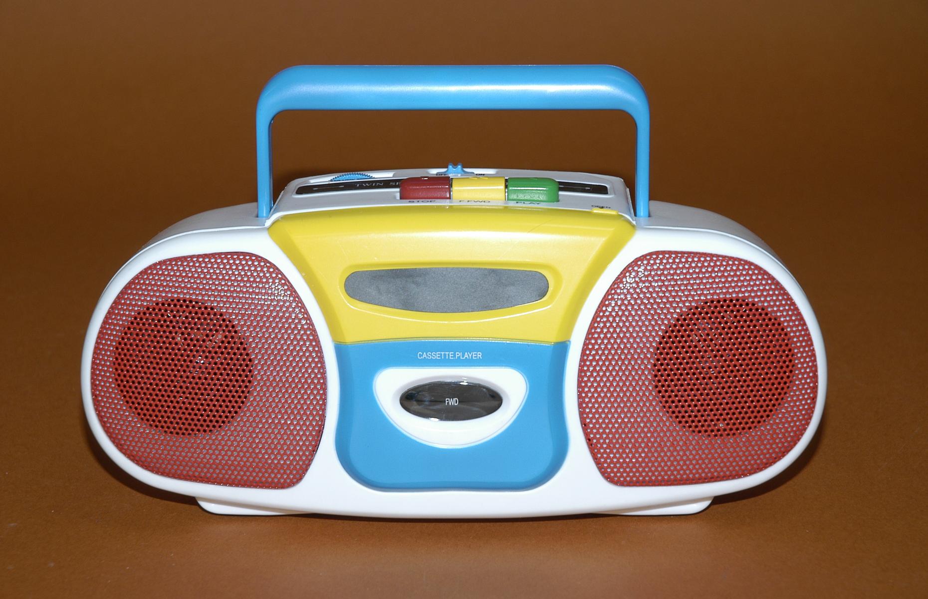 Kompakter Kinderkassettenrekorder im Ghettoblaster-Stil mit blauem Tragegriff. Der Kassettenrekorder ist weiß und bunt. Funktionen: Stop, Fast Forward, Play, Netzteilanschluß, Kopfhörerausgang.