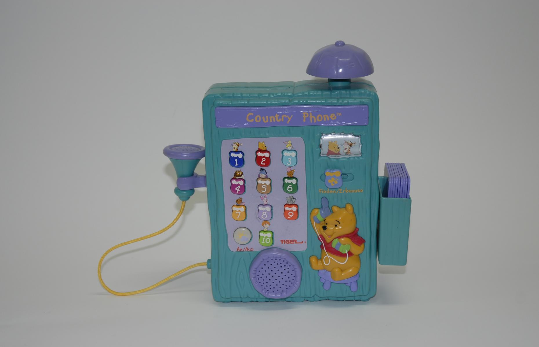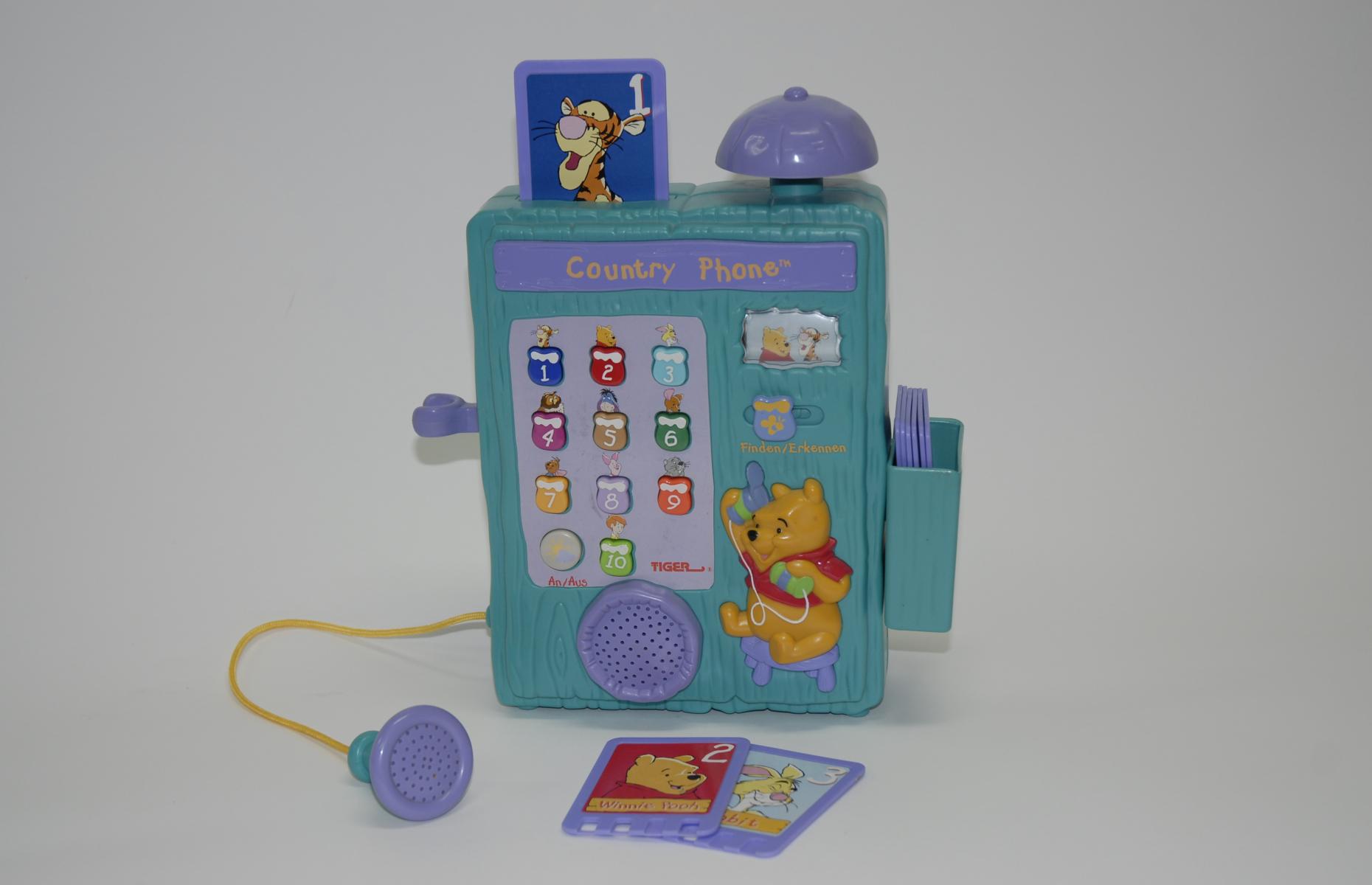Activity Board in Form eines öffentlichen Telefons, 10 Funktionskarten. Funktionen: Finden und Erkennen von Farben, Tieren und Zahlen. Wenn Karten eingelegt werden, klingelt Telefon.