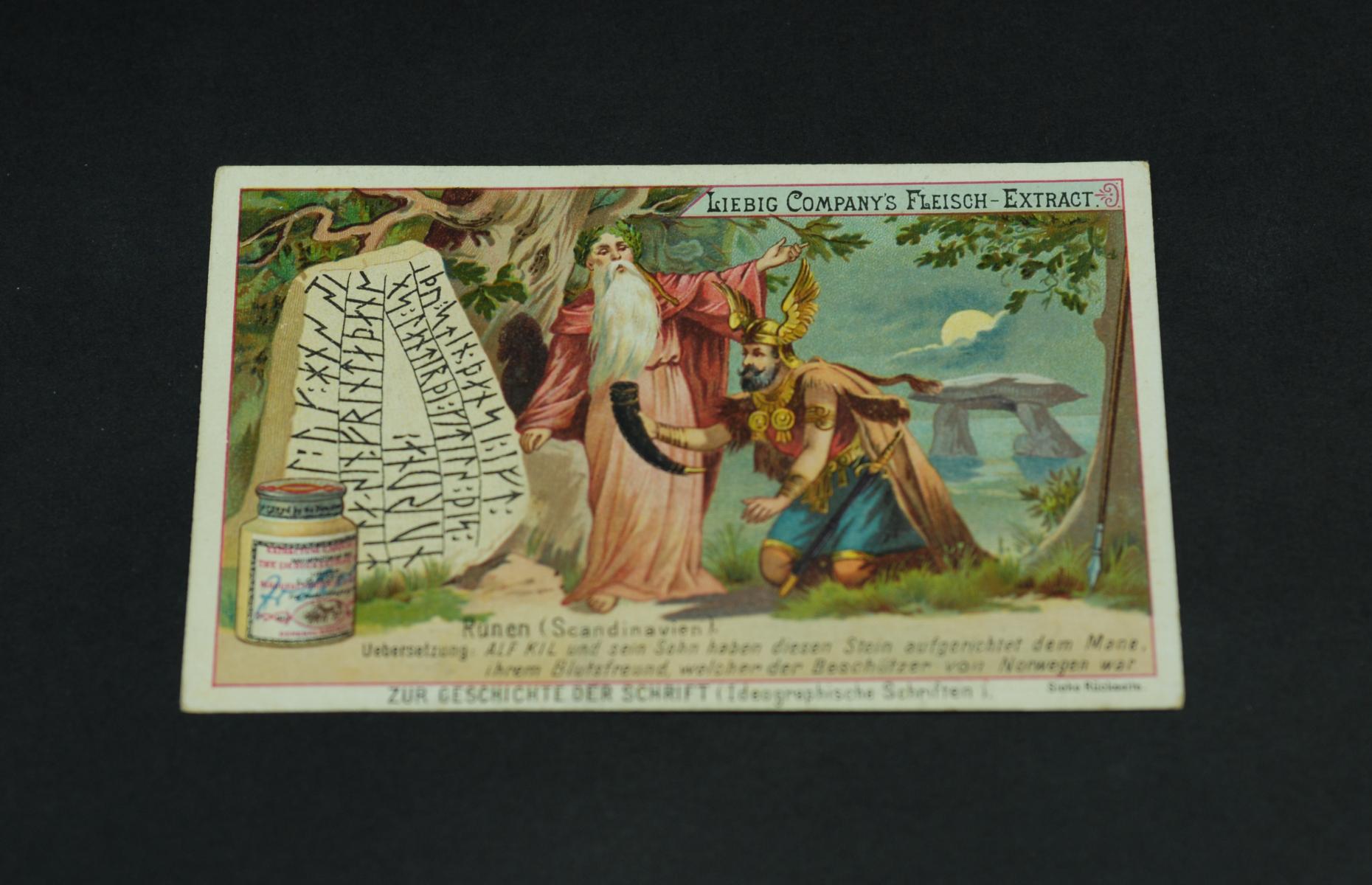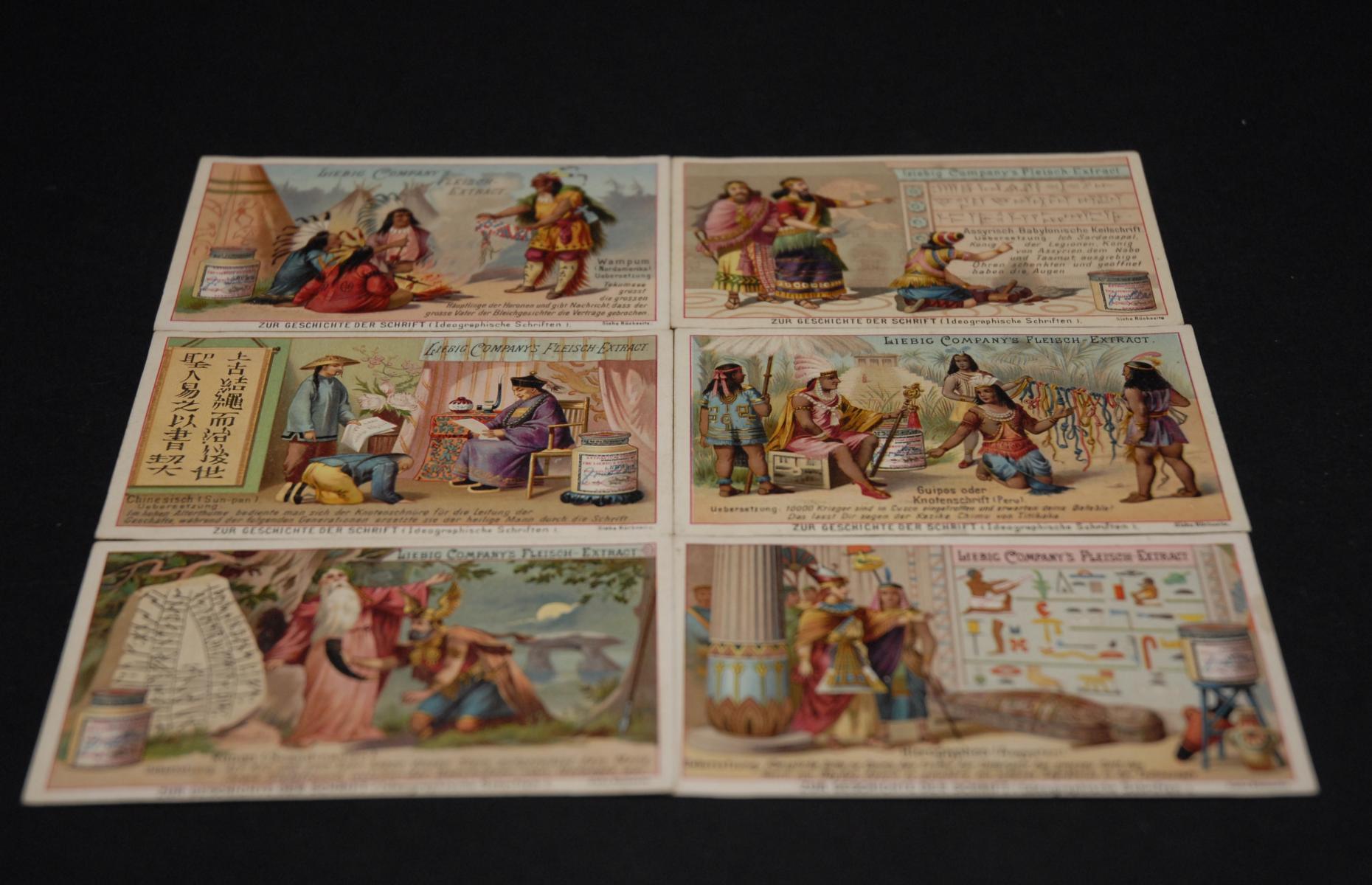 Die Bilder zeigen verschiedene Schriften des Altertums in ihrer Entstehungsumgebung. Skandinavische Runen, Assyrisch-babylonische Keilschrift, Chinesisch, Hieroglyphen, Peruanische Guipos oder Keilschrift, nordamerikanisches Wampum.